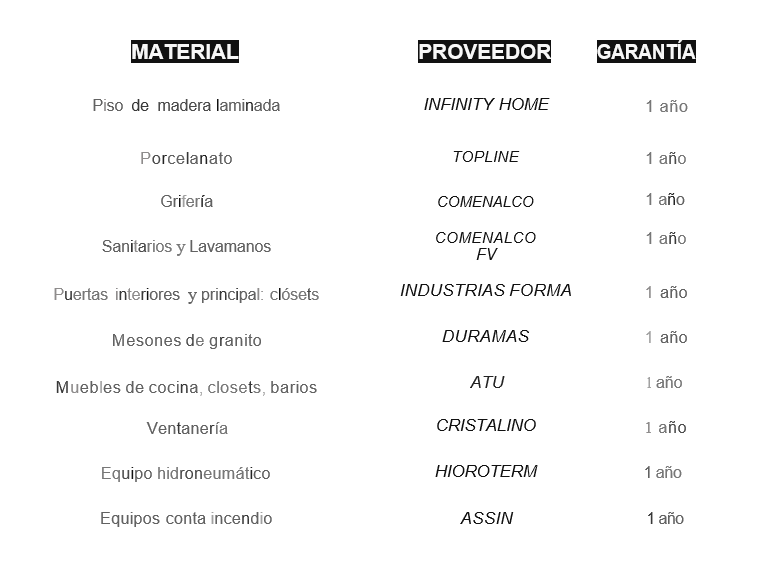 Esta garantía cubre los elementos que presenten mal funcionamiento o desgaste inusual bajo un uso adecuado de los mismos y que no estén cubiertos por garantía directa de fábrica o del proveedor. Así se atenderán, humedades en tumbados y paredes, carpintería metálica, de madera, cerraduras, bisagras, rieles de cajones, sardineles.